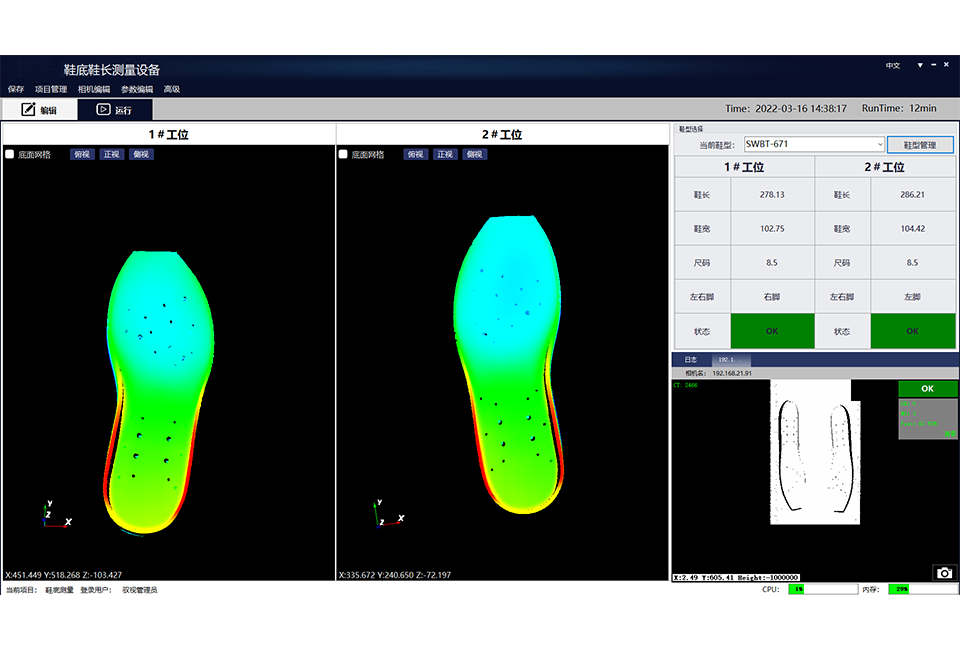 大底3D智能检测系统基于线激光扫描3D相机,,搭载自主研发的3D视觉软件,,,对大底进行智能码数识别和左右脚判断。。。线激光扫描3D相机获取深度图后,,,通过3D视觉软件进行数据处理,,,给出大底的长宽高尺寸,,,然后判断大底码数和左右脚,,,对不在码数要求尺寸范围内的大底进行剔除。。。。